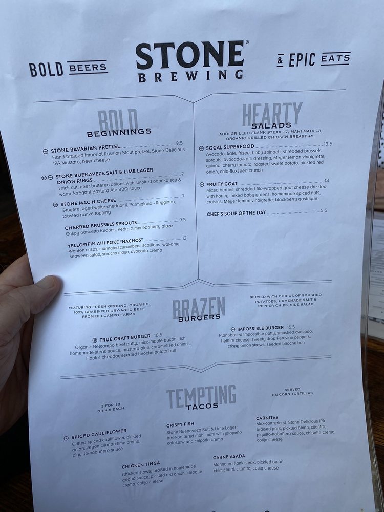 Start your meal with the Stone Delicious Bavarian Pretzel paired with their signature beer cheese or indulge in the Kung Pao Crispy Brussels Sprouts for a flavorful kick. The main offerings shine with the Stone Wagyu Luxe Burger and the SoCal Superfood Salad, both expertly crafted to please any palate.